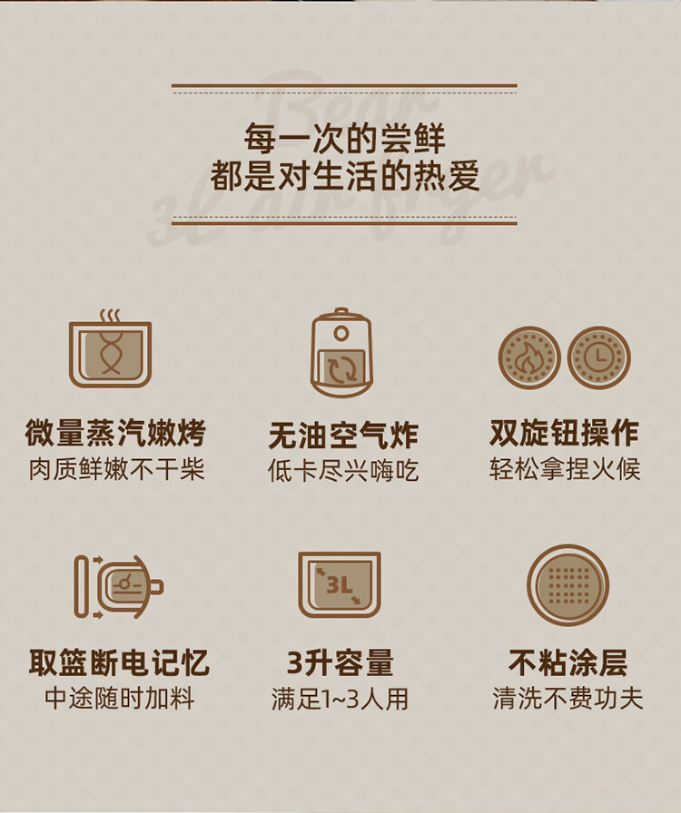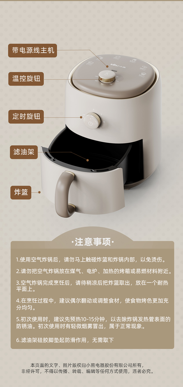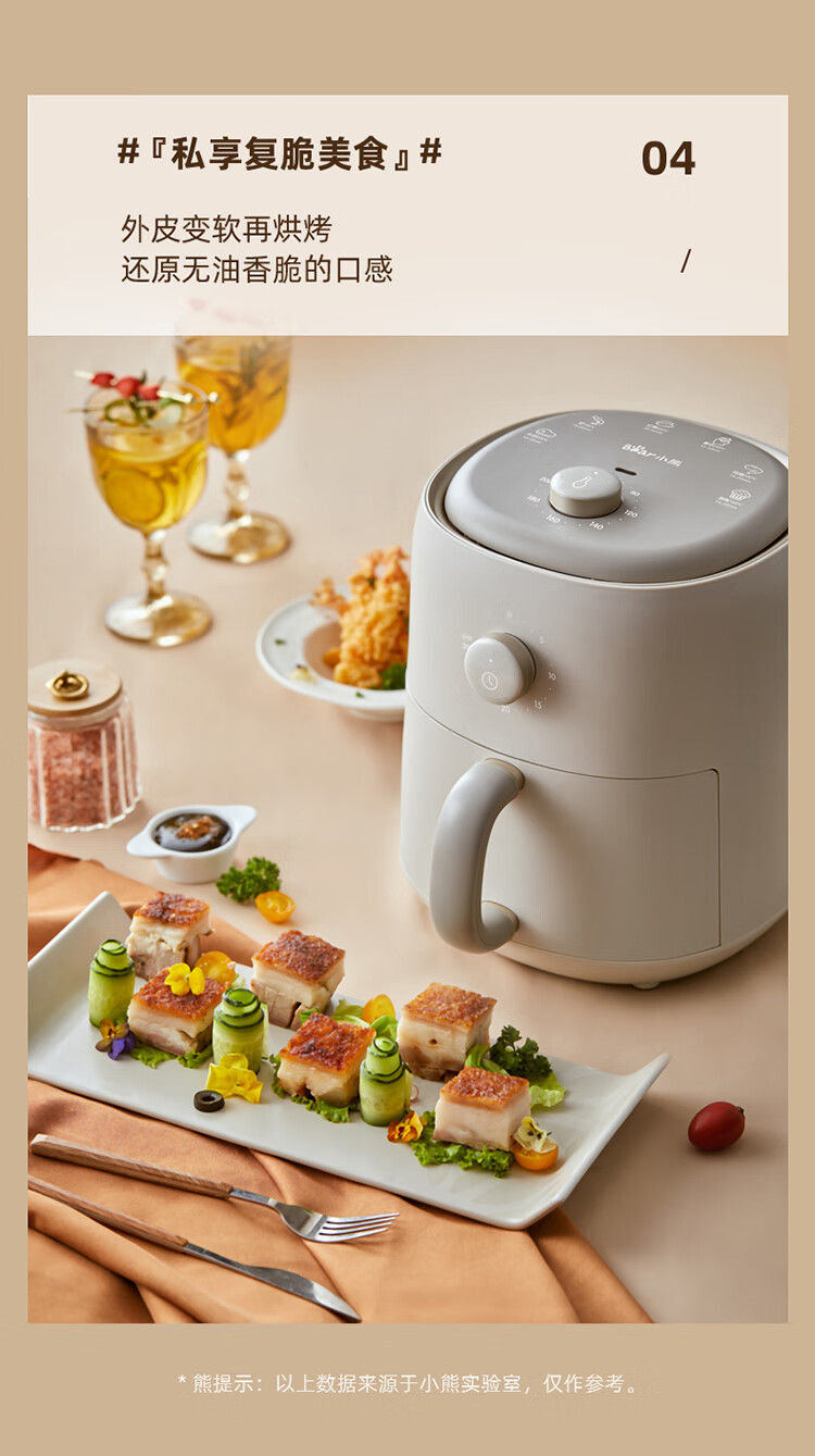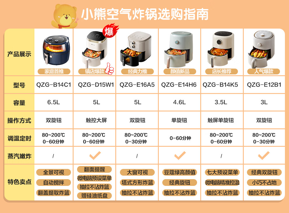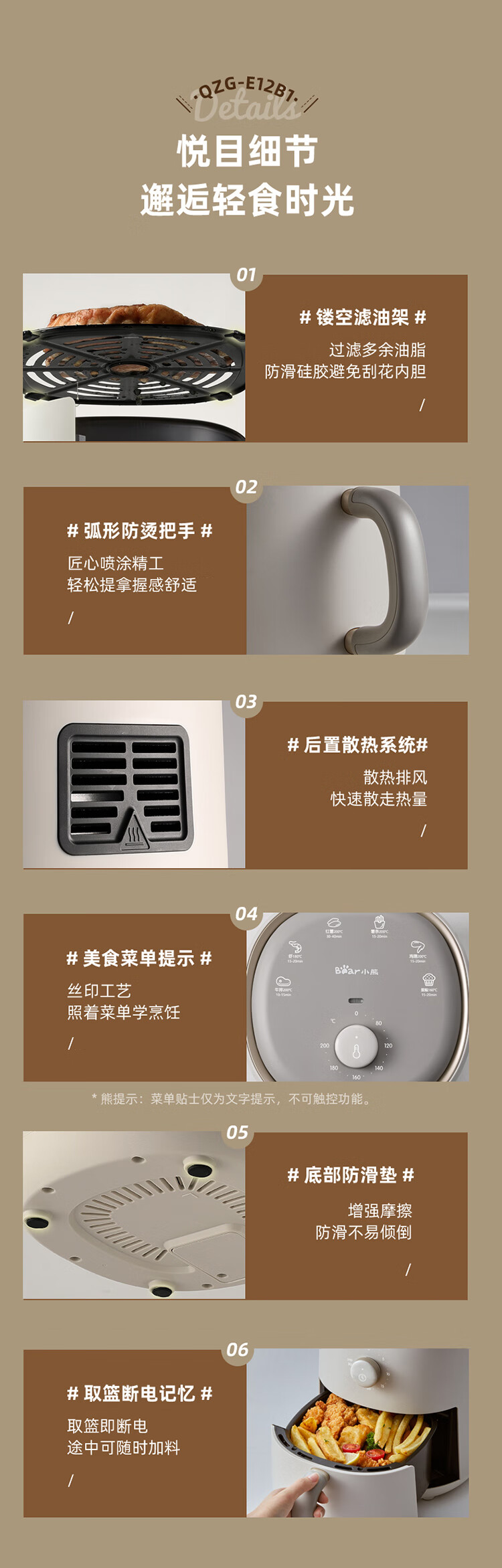 小熊(Bear)空气炸锅家用大功率无油烟低脂多功能电炸锅薯条机3L容量 QZG-E12B1 自营