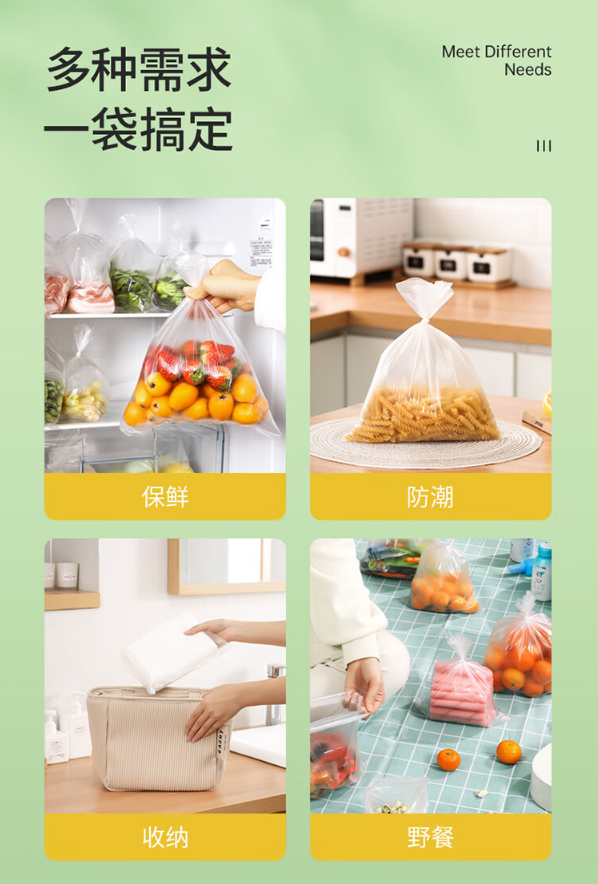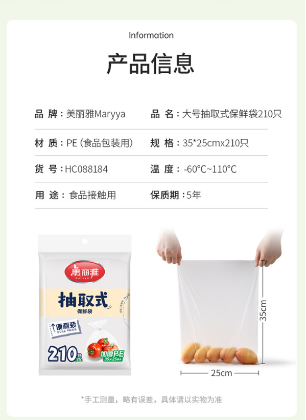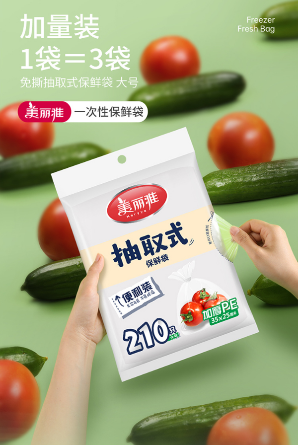 美丽雅 一次性抽取式保鲜袋210只大号35*25cm 方便袋食品级家用厨房冰箱冷冻冷藏分装袋 自营