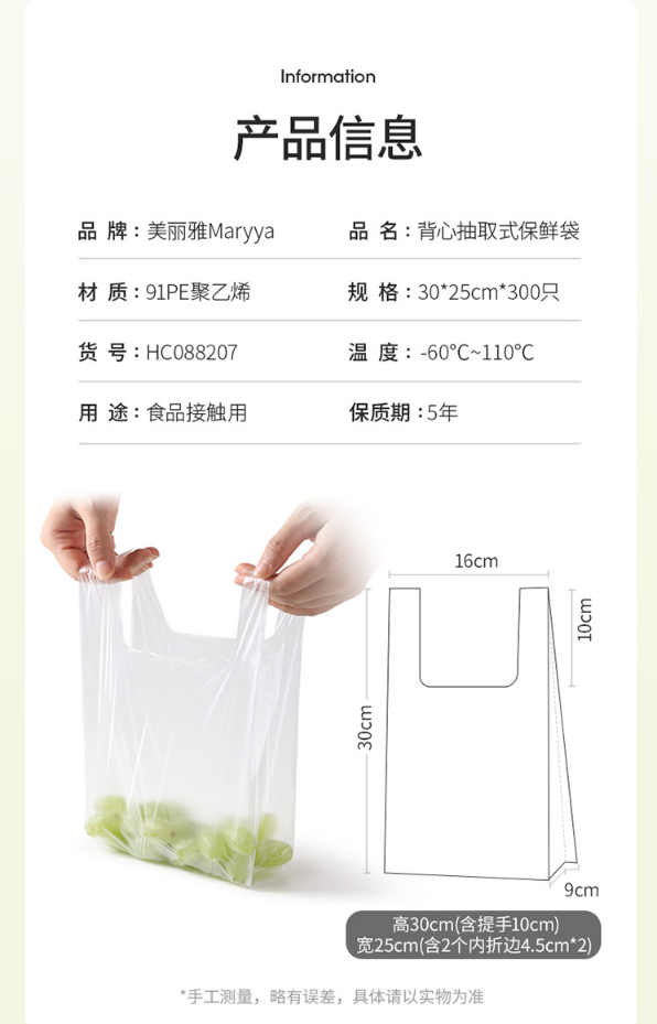 美丽雅 一次性背心式抽取保鲜袋300只30*25cm 食物保鲜方便袋食品级家用厨房冰箱冷冻冷藏分装袋 自营