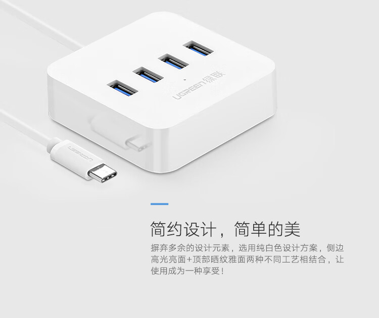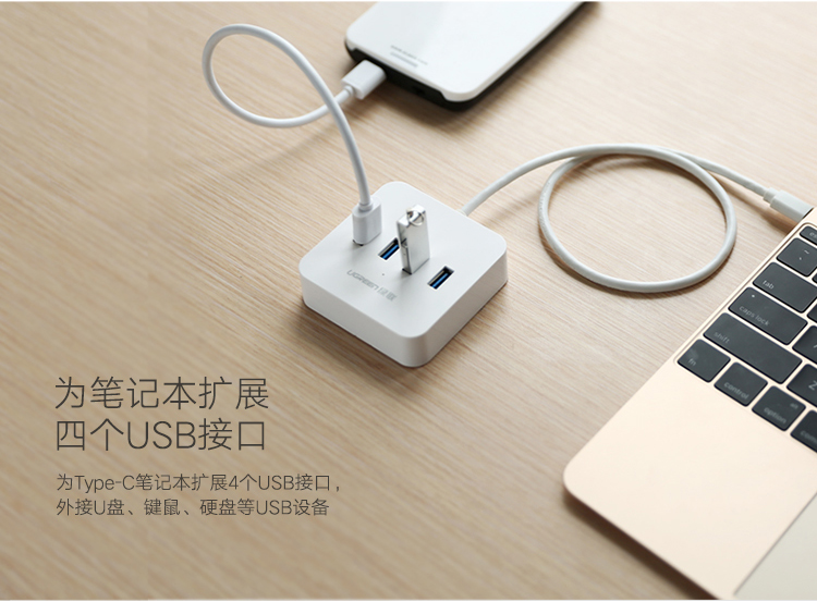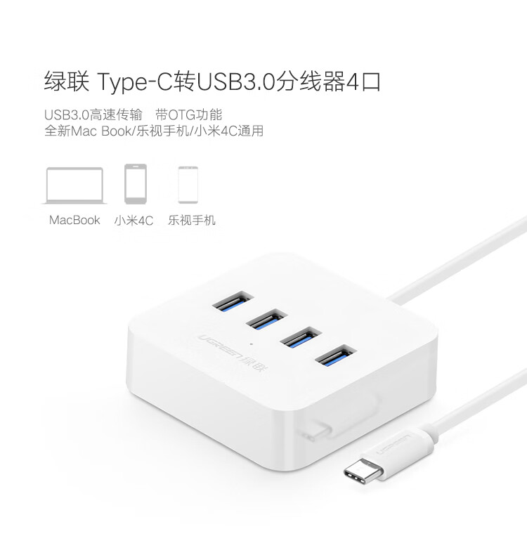 绿联 Type-C3.0分线器 USB-C高速4口集线器HUB扩展坞 笔记本电脑延长线转换器 适用苹果华为小米手机笔记本 自营