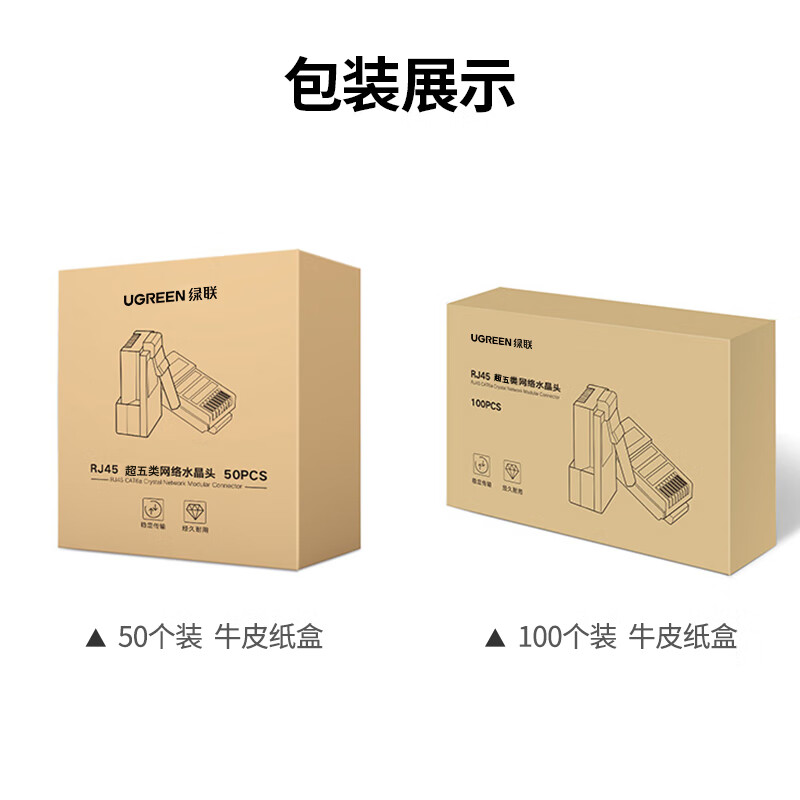 绿联(UGREEN)超五类水晶头 千兆网络RJ45网络水晶头 电脑网线接头 Cat5e水晶头 100个/袋 50246 自营