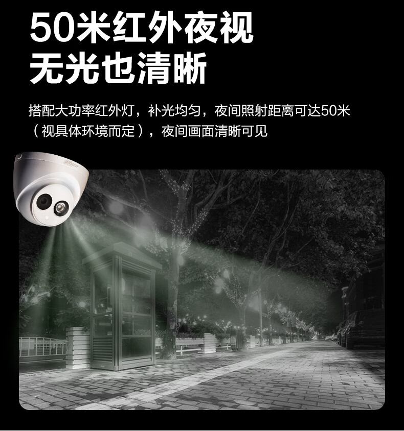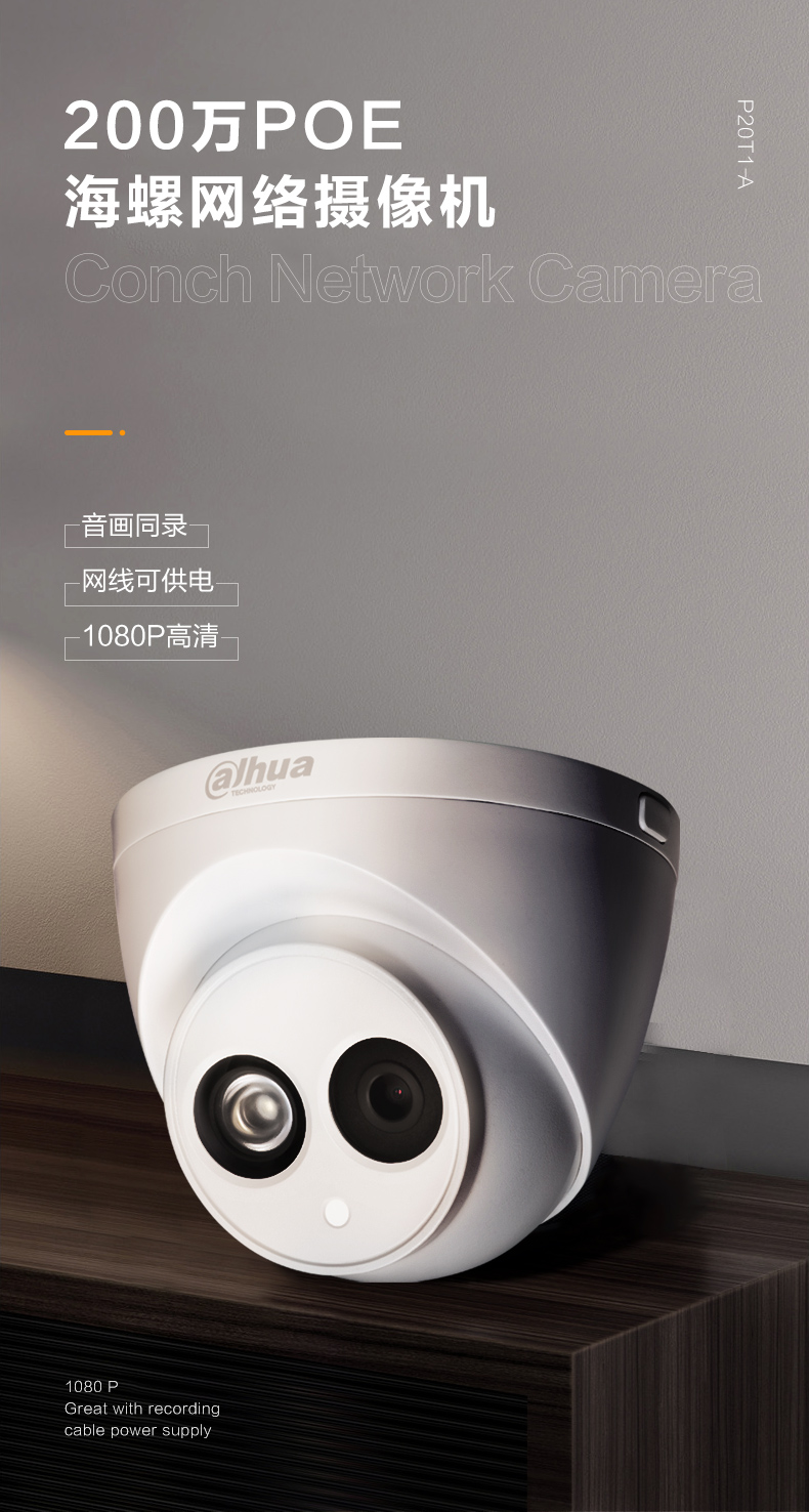 大华dahua监控摄像头 200万网络高清半球监控摄像机H.265 带POE红外夜视半球摄像机 P20T1-A-3.6mm 自营