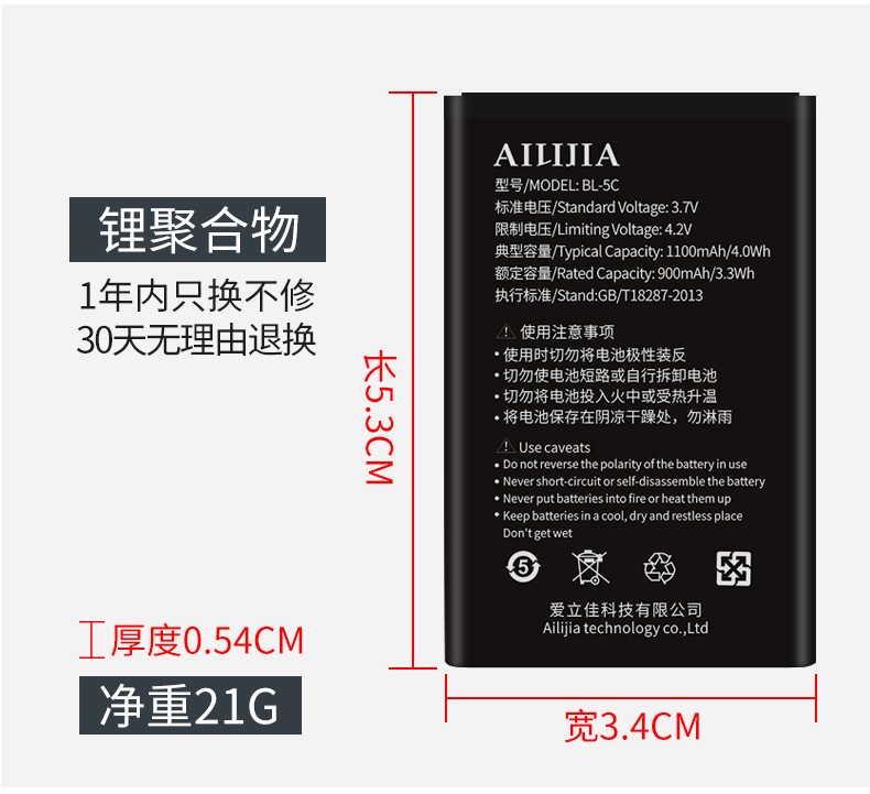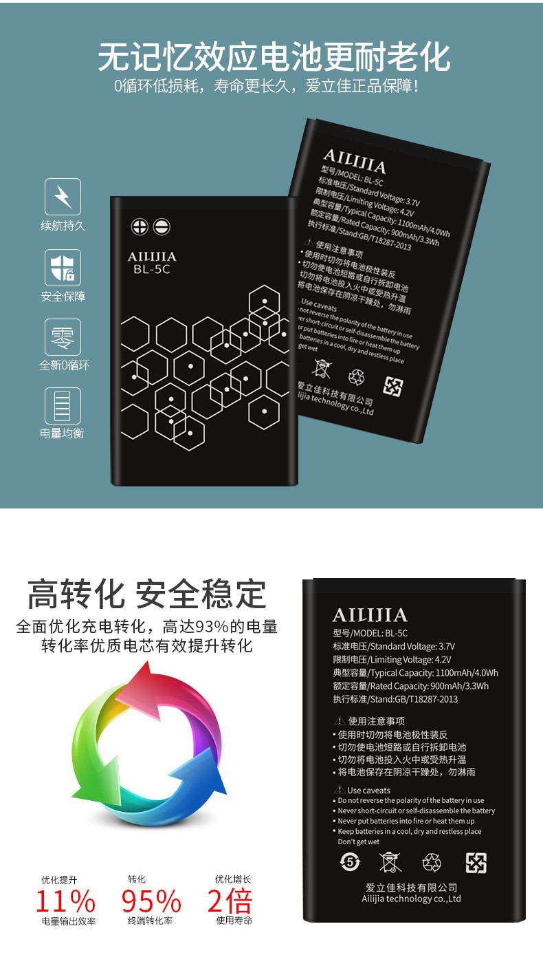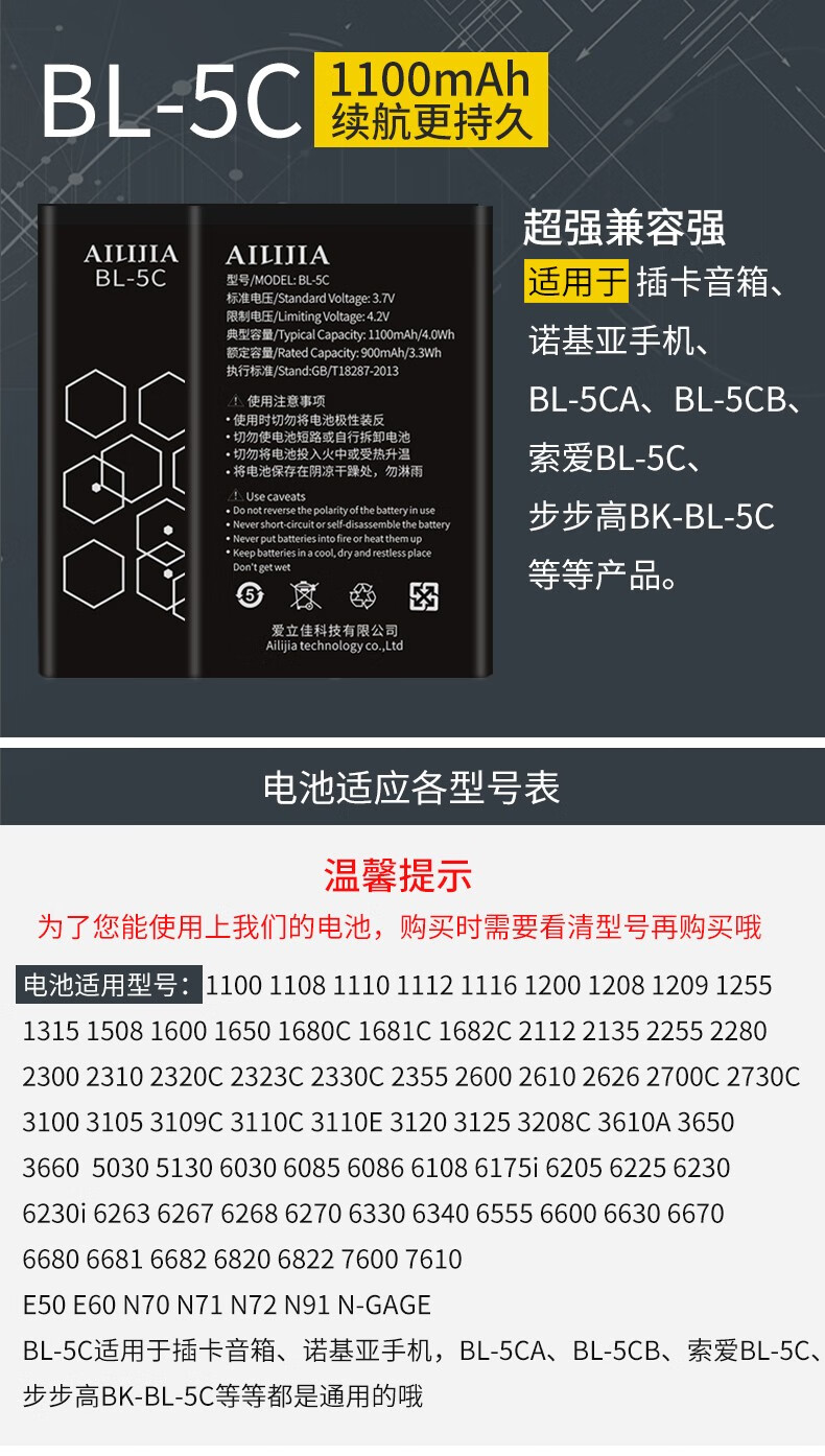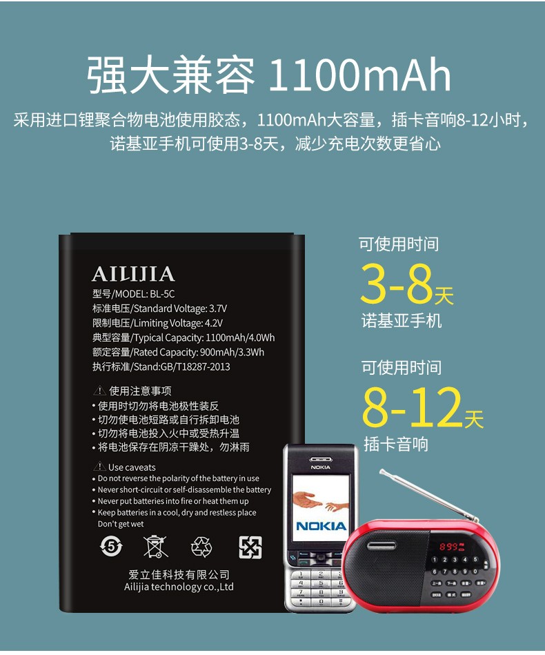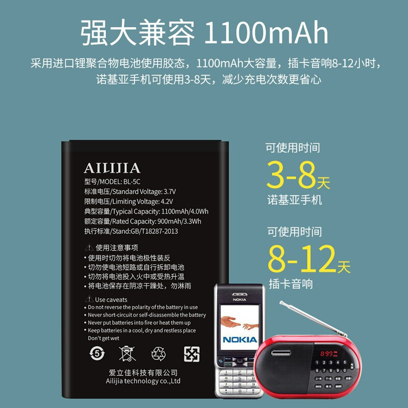 爱立佳BL-5C适用诺基亚手机锂电池2610插卡3.7V小音箱响1110 收音机3100 5CA全新 BL-5C【大容量1100mAh】