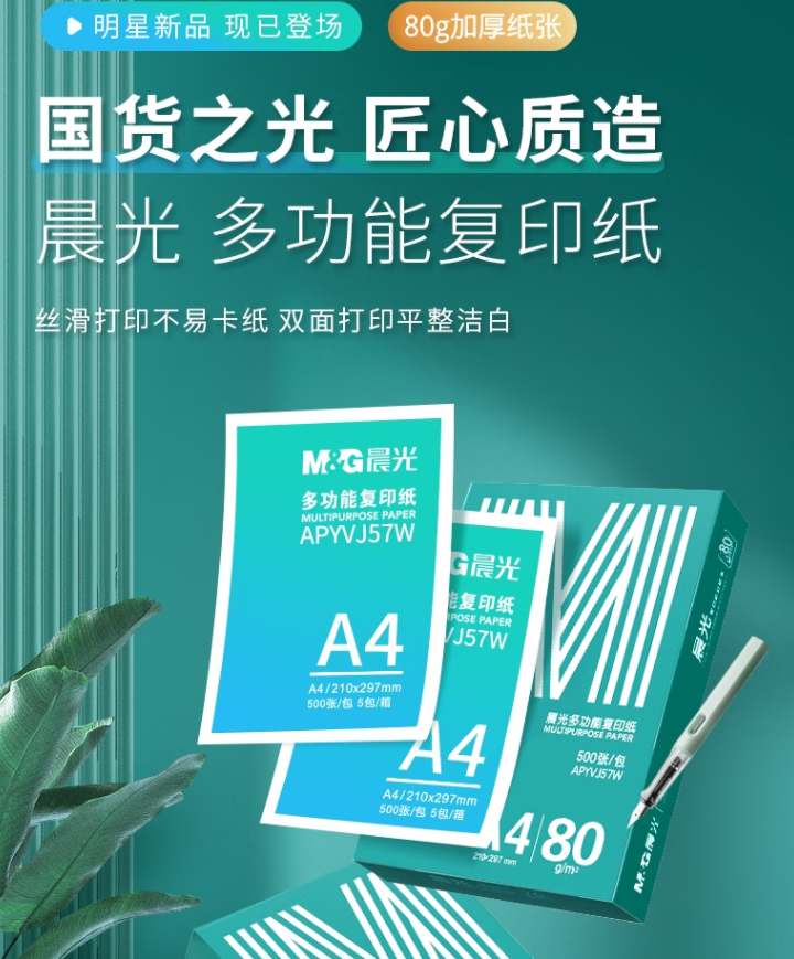 晨光(M&G) A4 80g 加厚多功能双面打印纸 高性价比复印纸 500张 绿晨光** 自营