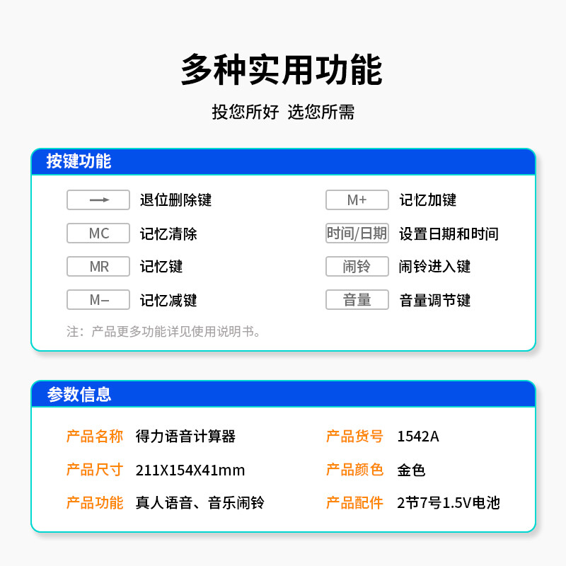 得力(deli)12位大屏幕语音计算器 闹钟日历功能计算机 学生/办公口算 金色** 自营