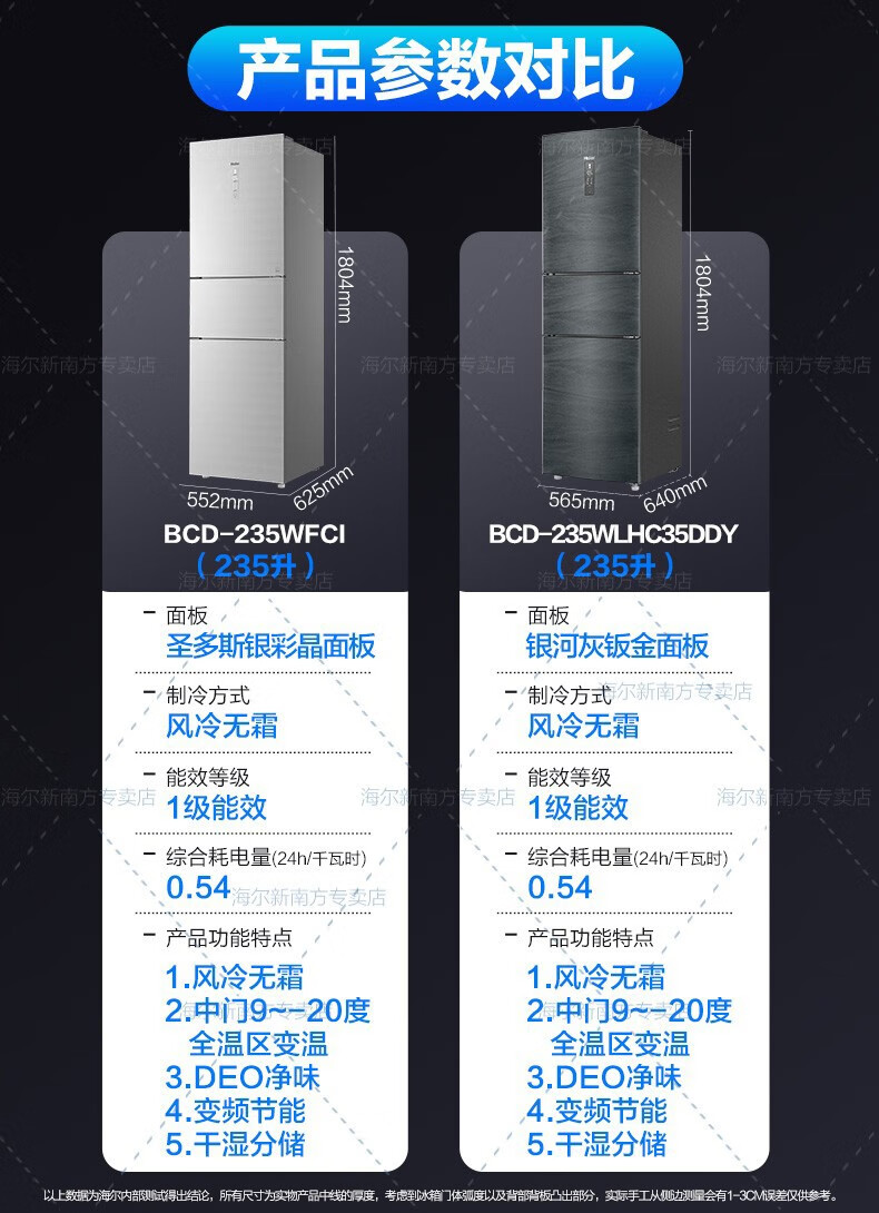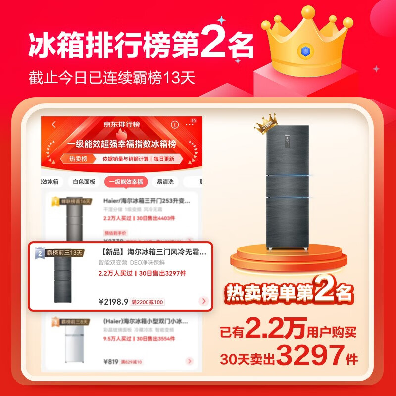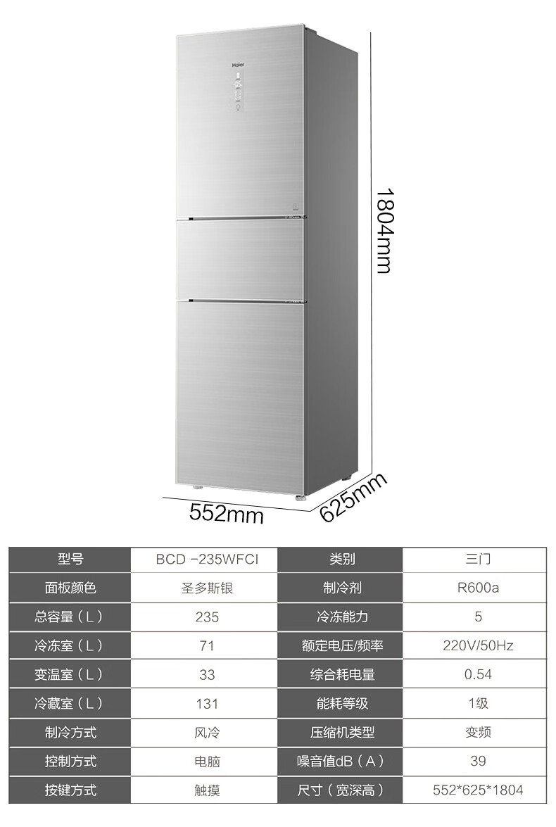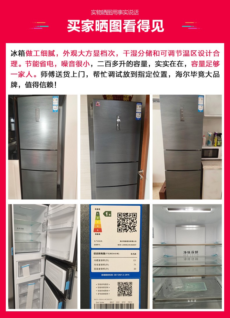 海尔(Haier)海尔冰箱超薄三门家用风冷无霜小型省电节能电冰箱小冰箱一级能效阻氧干湿分储 235升彩晶玻璃面板BCD-235WFCI** 自营