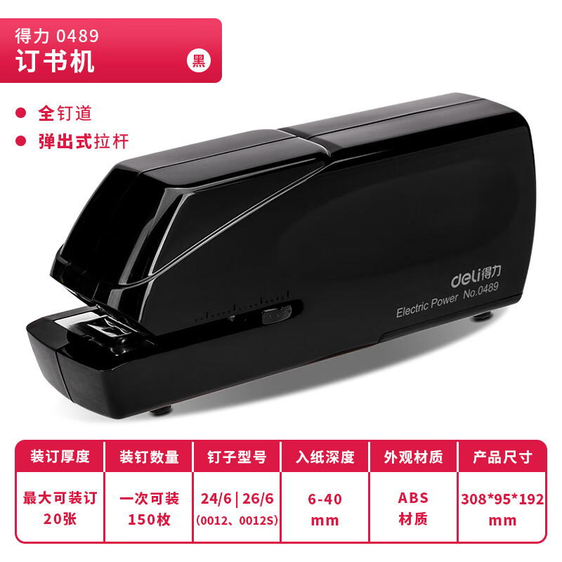 得力(deli)双电源电动订书机 电子自动装订订书器 适配24/6或26/6订书钉 办公用品 黑色0489** 自营