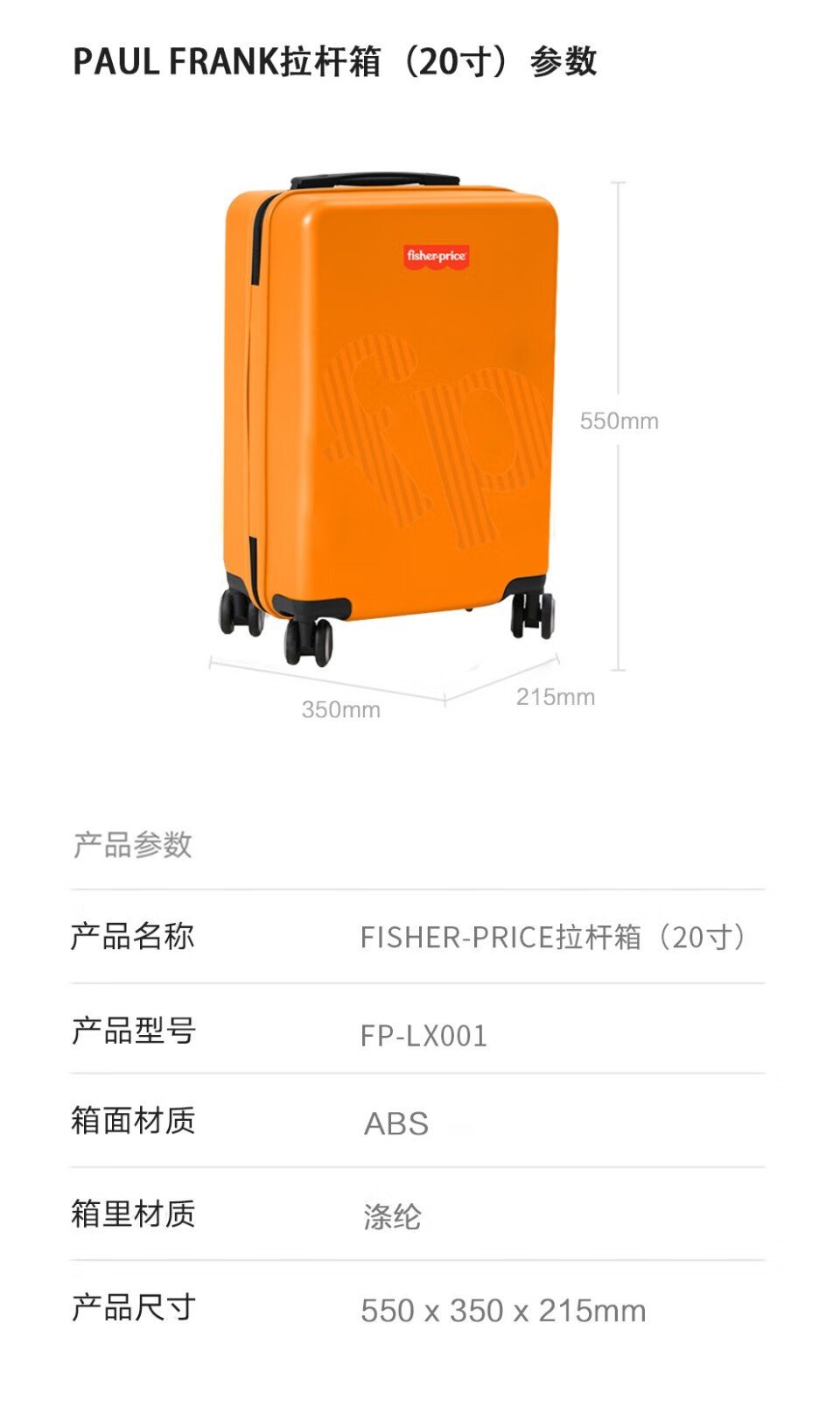 Fisher-Price费雪 拉杆箱FP-LX001万向轮登机旅行箱20寸 桔色 自营