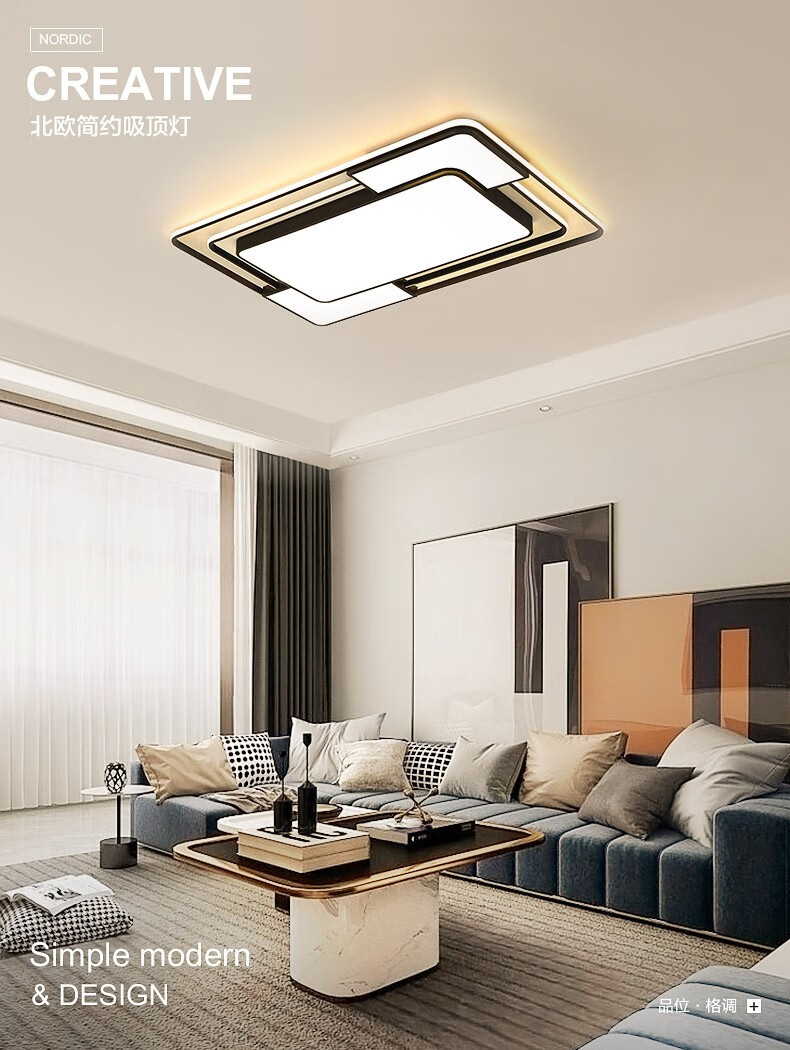 倔强大师优质铁艺+亚克力三色变光吸顶灯 96瓦*2 821长方形 黑色 尺寸:900*600*80 自营