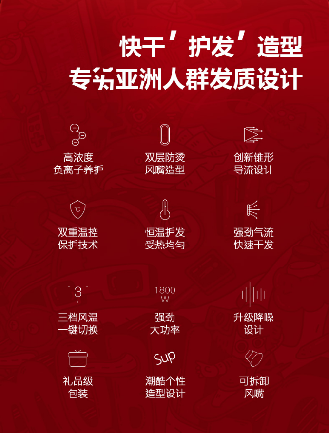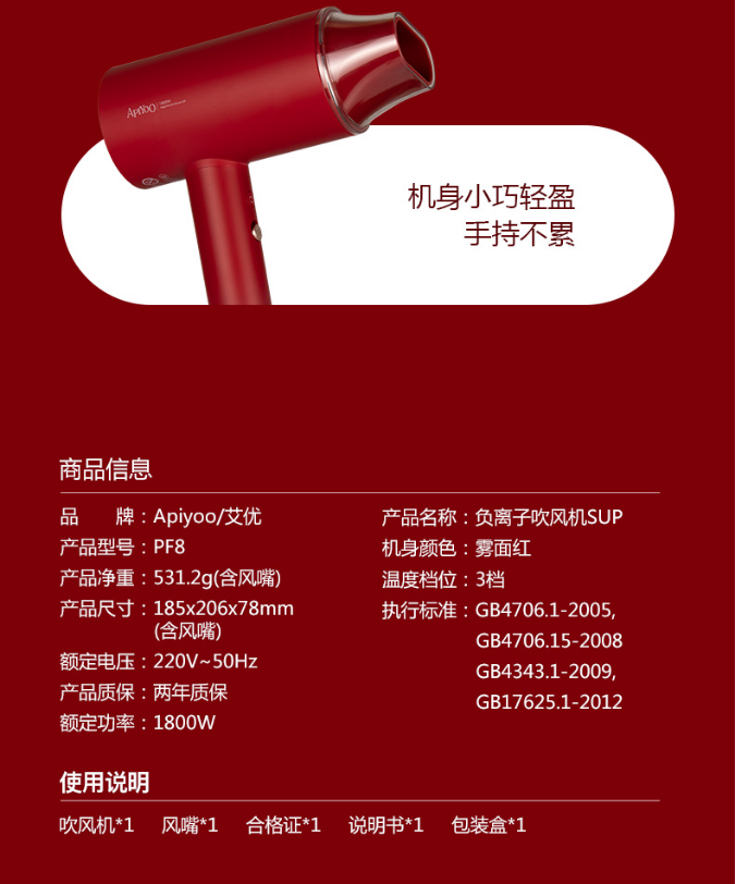 商品名称:ApiYooAY20160009 商品毛重:500.00g 商品产地:中国大陆 适用发质:中性,油性 特色功能:负离子,高速吹风,恒温护发 适用场景:礼盒,家用