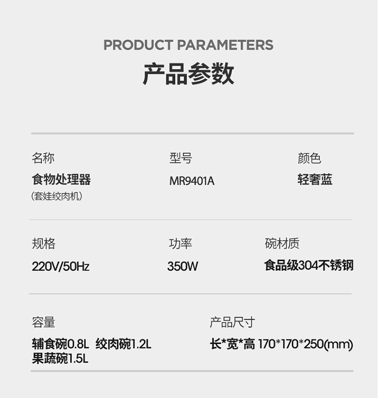 商品名称:摩飞电器MR9401  商品毛重:2.64kg   商品产地:中国大陆     刀头数量:1个   类别:绞肉机容量:1.3-1.5L   机头材质:金属       适用人数:3-5人    功能:快速剥蒜,绞肉灌肠,多碗易收纳   杯体材质:不锈钢    操控方式:按键式    杯体数量:多杯