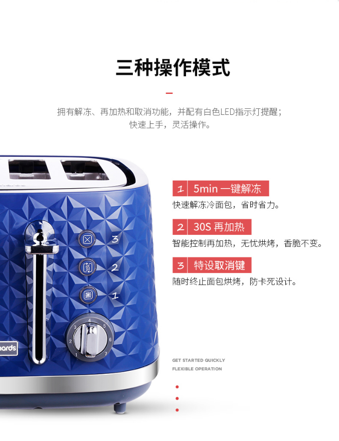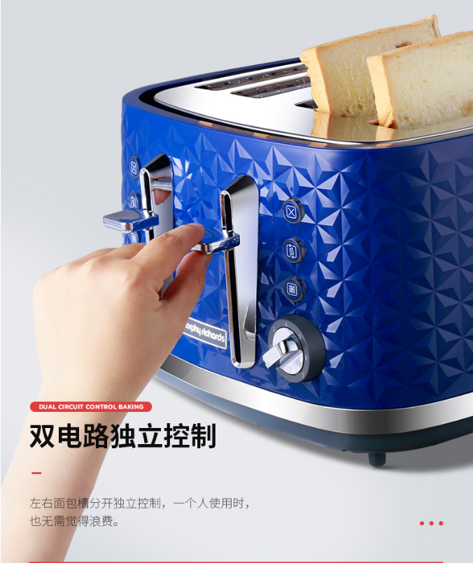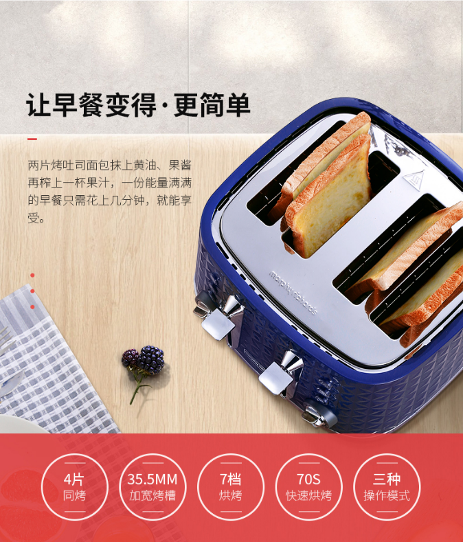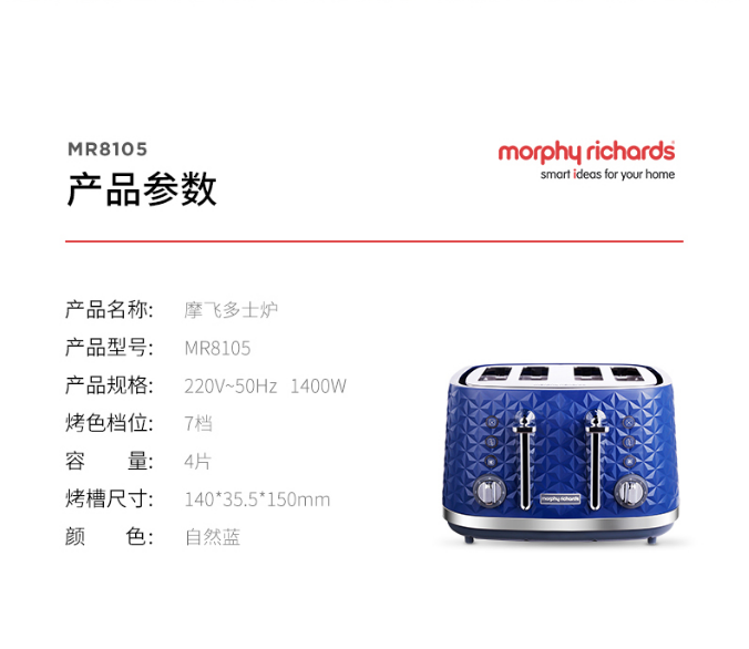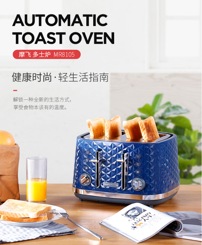 商品名称:摩飞电器MR8105 商品毛重:3.3kg 商品产地:中国大陆 特色功能:双管烘烤 容量:500g以下 加热方式:电热管 类型:多士炉搅拌叶片 种类:无搅拌叶片 液晶显示:无液晶显示 操控方式:按键式
