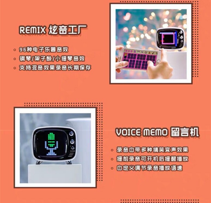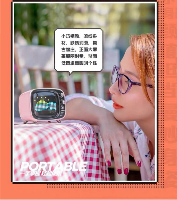 商品名称:Divoom 点音TIVOO迷你闹钟无线蓝牙智能音箱电视机录音TF插卡复古像素小音响 红色 商品毛重:400.00g 适用场景:K歌 类别:智能音箱