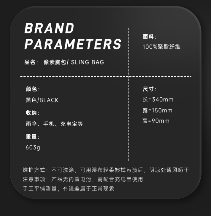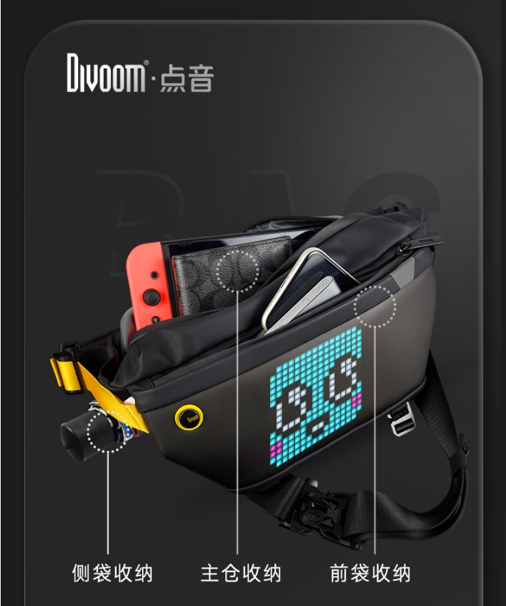 商品名称:DivoomPixoo-slingbag 商品毛重:1.5kg 商品产地:中国大陆 货号:Pixoo-SlingBag 材质:PU(聚氨酯) 里料材质:涤纶(聚酯纤维) 类别:斜挎包 上市时间:2021年夏季 附属肩带:单根 适用人群:青年,中年,青少年 内部结构:拉链暗袋,夹层拉链袋 闭合方式:拉链 风格:休闲风 包袋大小:中包 图案:纯色 流行元素:车缝线