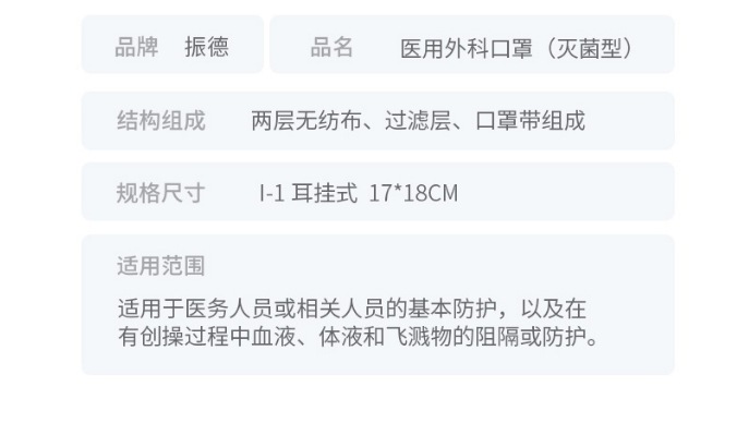 商品名称:振德外科口罩 50只/盒 商品毛重:400.00g 商品产地:中国大陆 货号:M742317180111K-13口罩 佩戴方式:耳戴式 类别:医用外科 口罩特点:防花粉/粉尘 类型:折叠式 是否灭菌级:灭菌级 国产/进口:国产