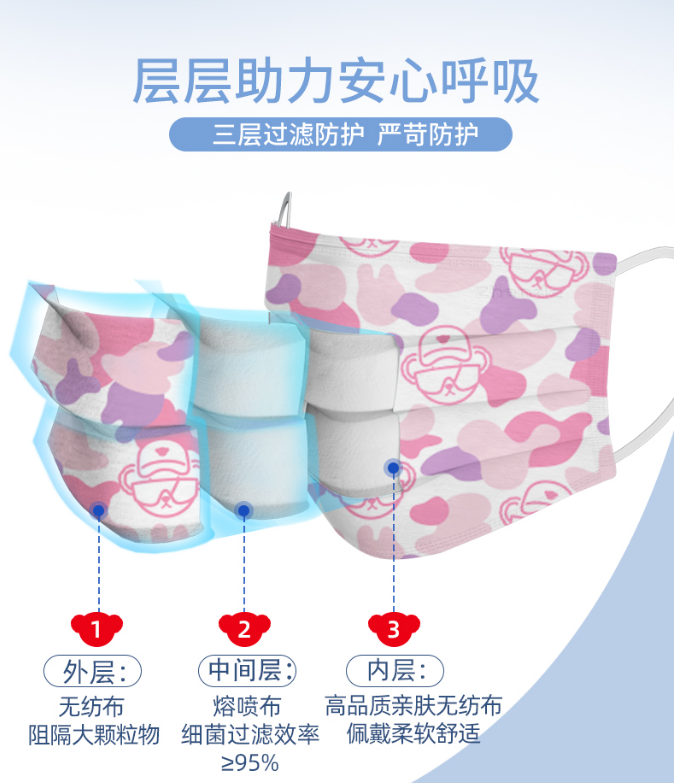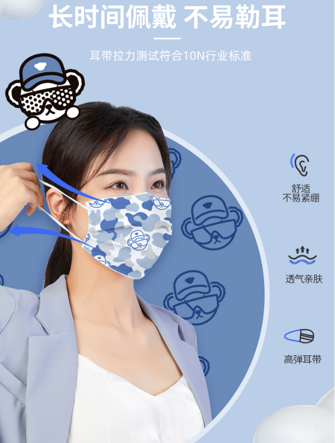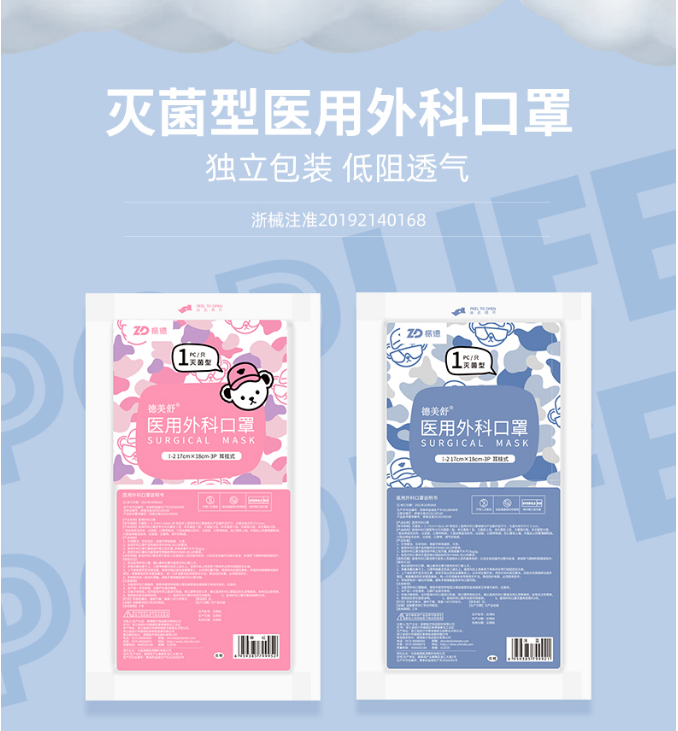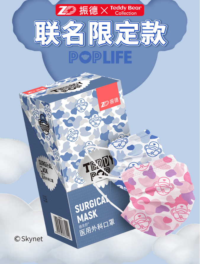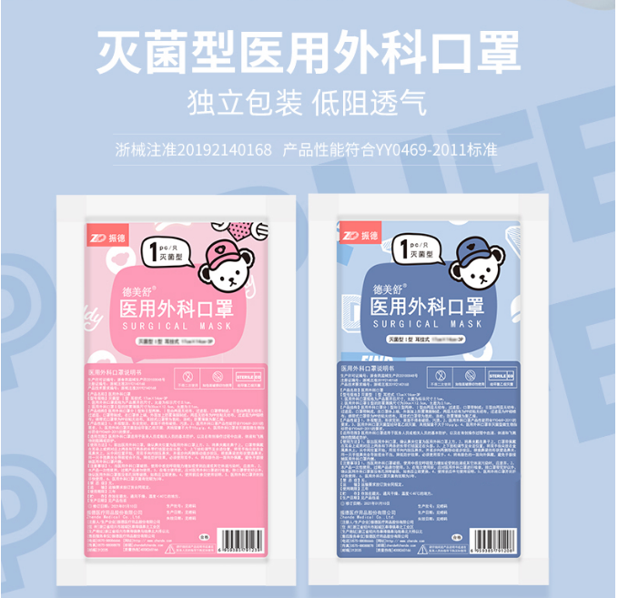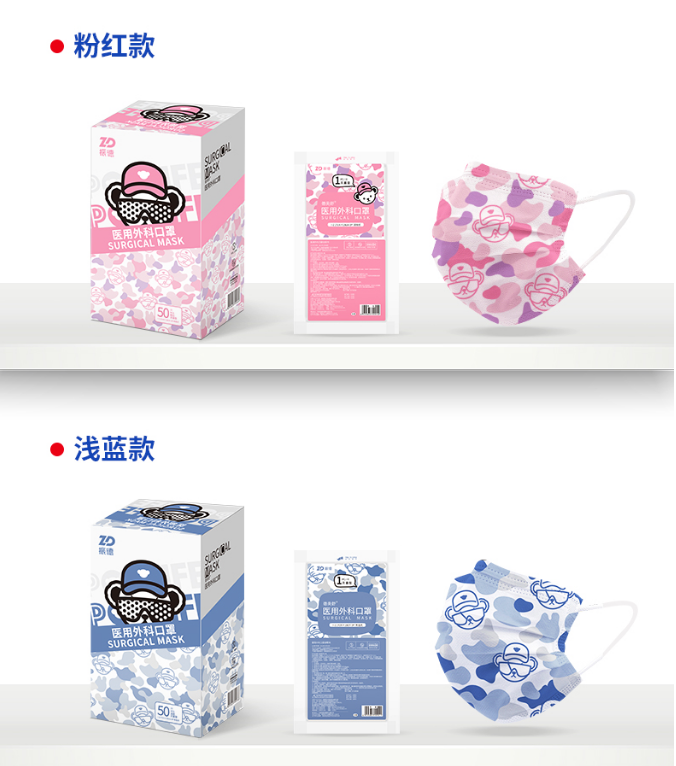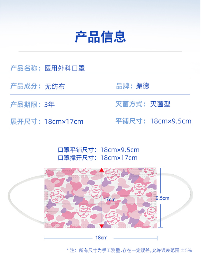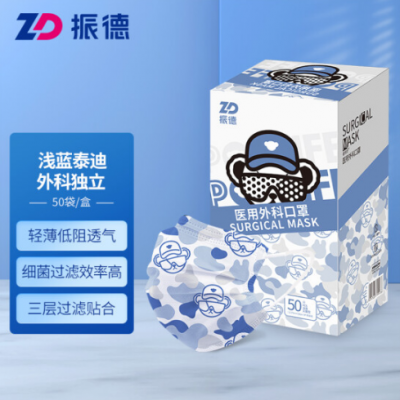 商品名称:振德浅蓝泰迪款外科口罩 50只/盒 独立装 商品毛重:450.00g 商品产地:中国大陆 货号:M742317180111K-15 口罩佩戴方式:耳戴式 类别:医用外科 口罩类型:折叠式 是否灭菌级:灭菌级 国产/进口:国产