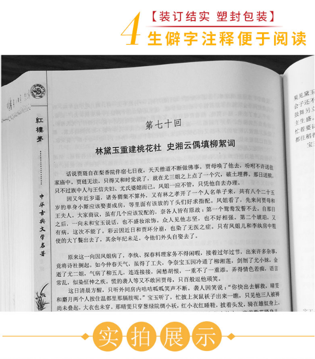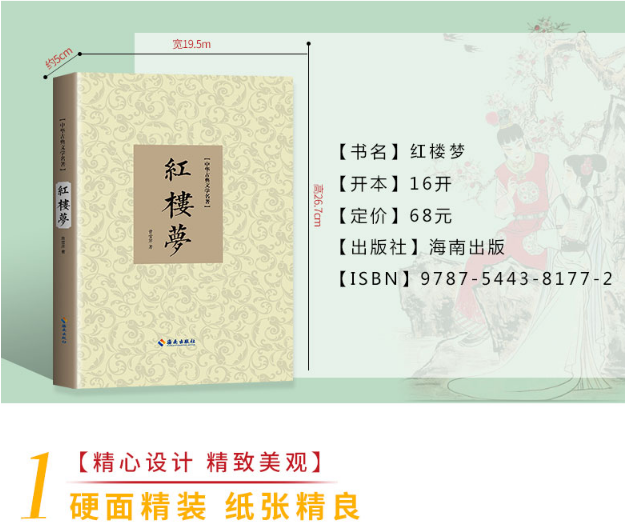 《红楼梦/中华古典文学名著》以贾、史、王、薛四大家族的兴衰为背景,以贾宝玉、林黛玉、薛宝钗的爱情故事为主线,刻画了以贾宝玉和金陵十二钗为中心的正邪两赋有情人的人性美和悲剧美,揭露了封建社会后期的种种黑暗和罪恶,及其不可克服的内在矛盾。中国封建社会的百科全书,传统文化的集大成者,被誉为中国古典四大名著之首。