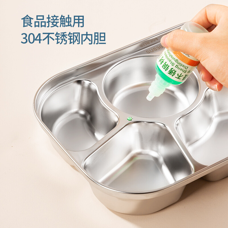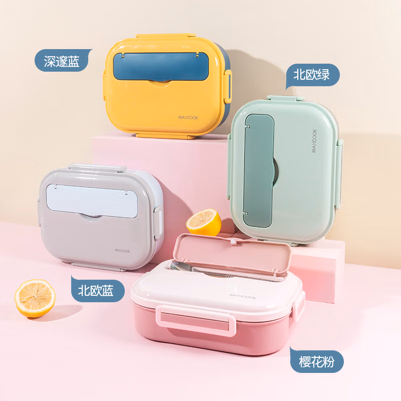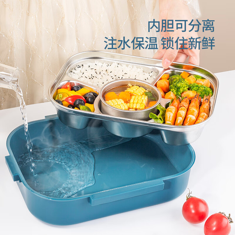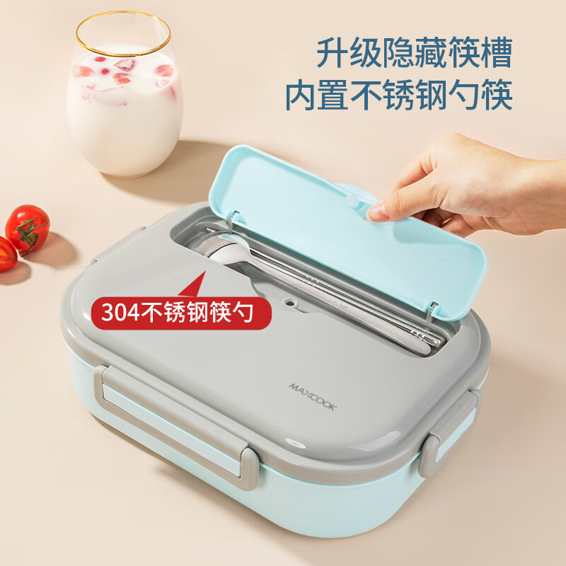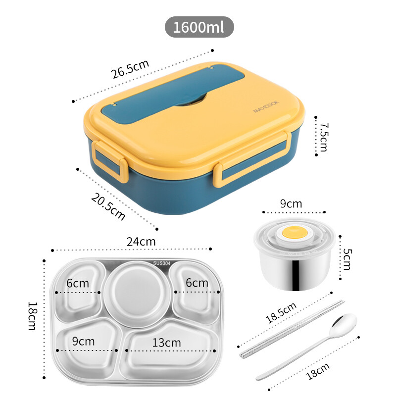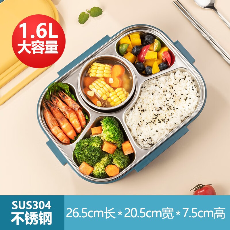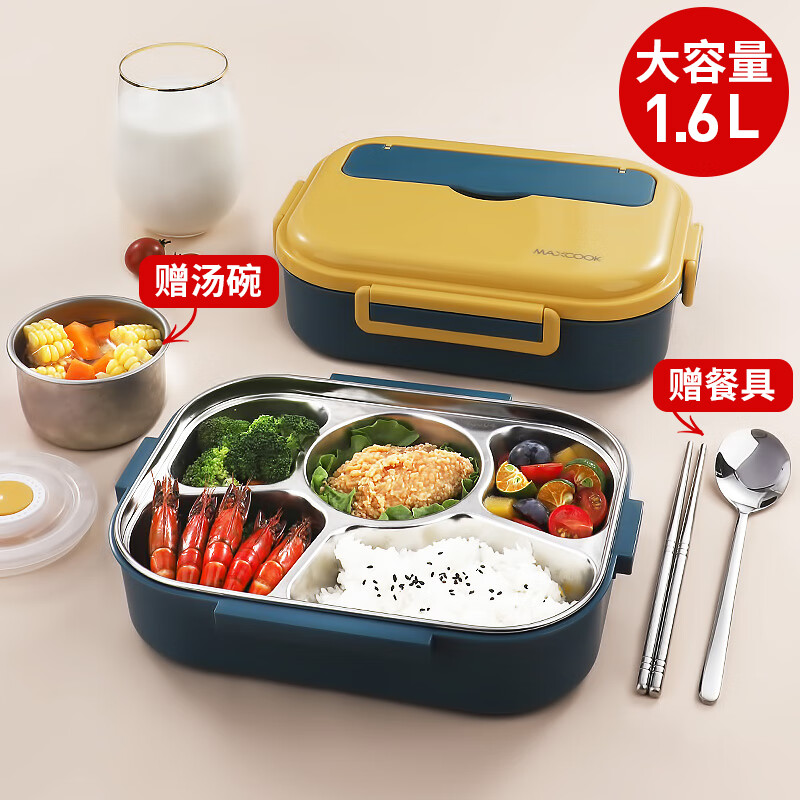 美厨(MAXCOOK)304不锈钢饭盒 4.5cm加大加深学生分格餐盒分隔饭盒男女保温便当盒配密封盖 深邃蓝五格1.6L【配筷勺+汤碗】MCFT535 自营