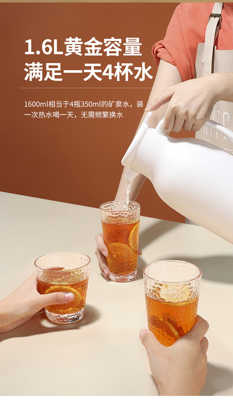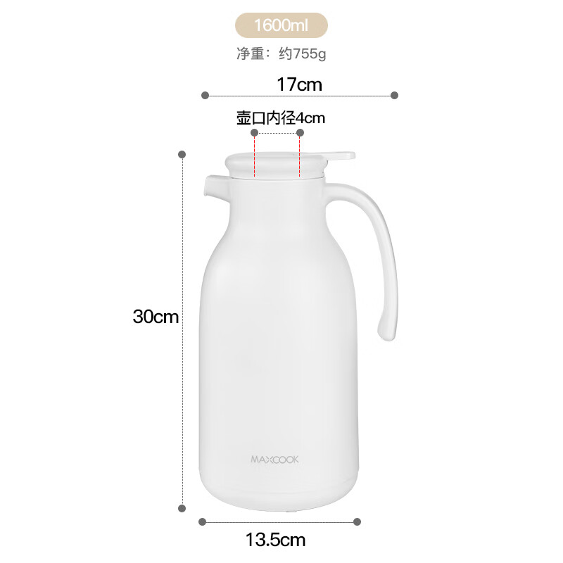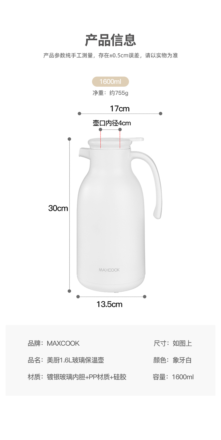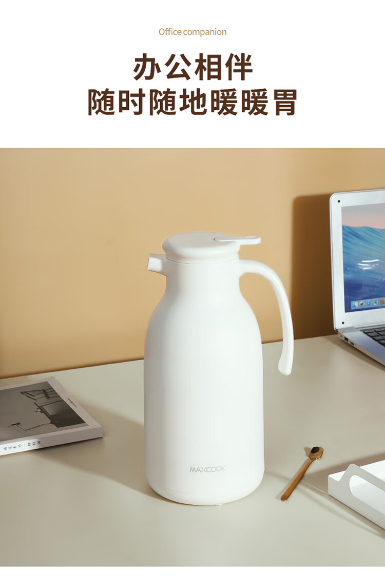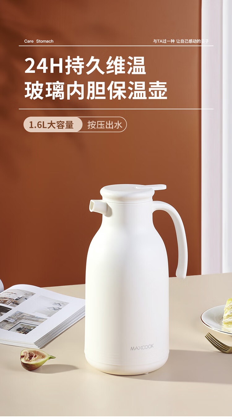 美厨(maxcook)保温壶 玻璃内胆真空热水壶保温瓶暖壶开水瓶 大容量防滑咖啡壶1.6L 象牙白MCH2182 自营