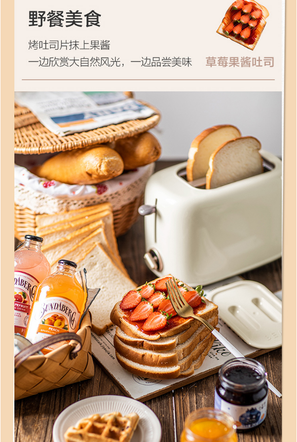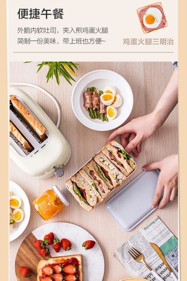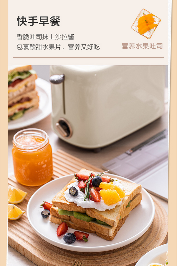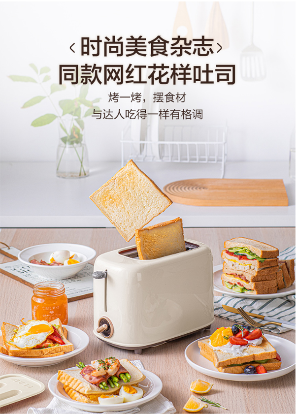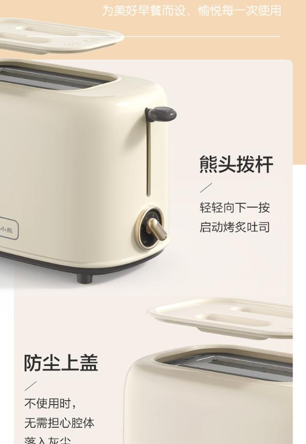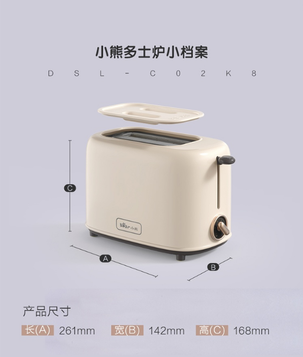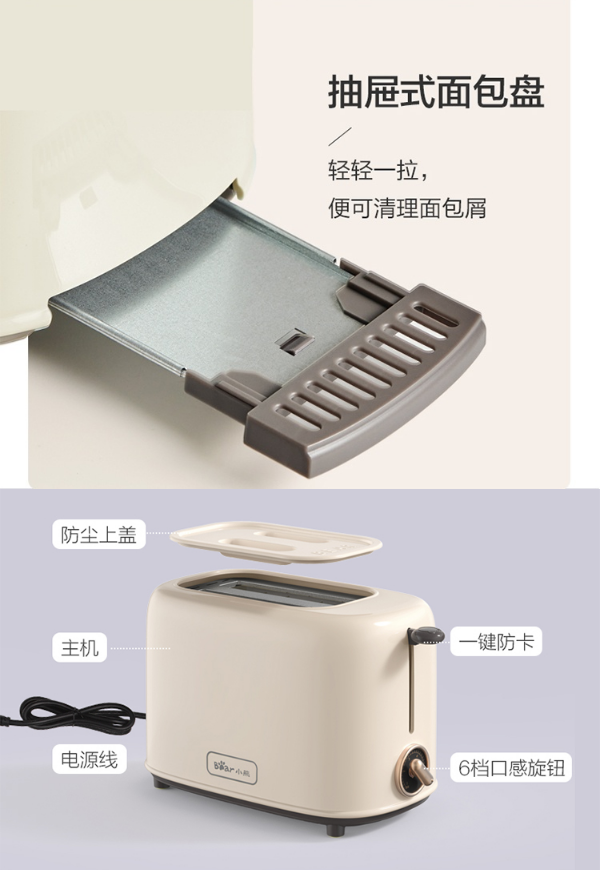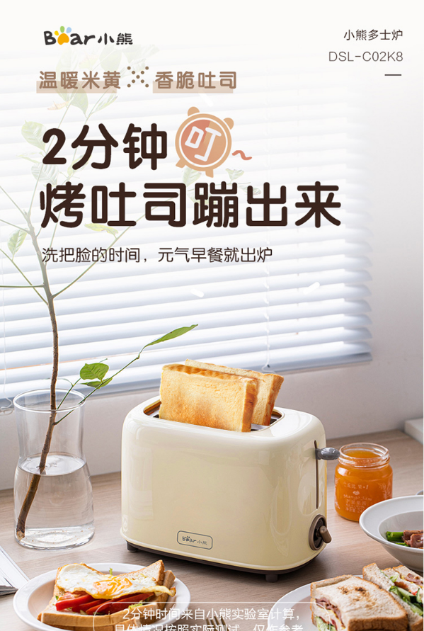 小熊(bear)面包机 多士炉早餐烤吐司机 烤面包片2片家用多功能轻食机 6档烘烤带防尘盖DSL-C02K8 自营