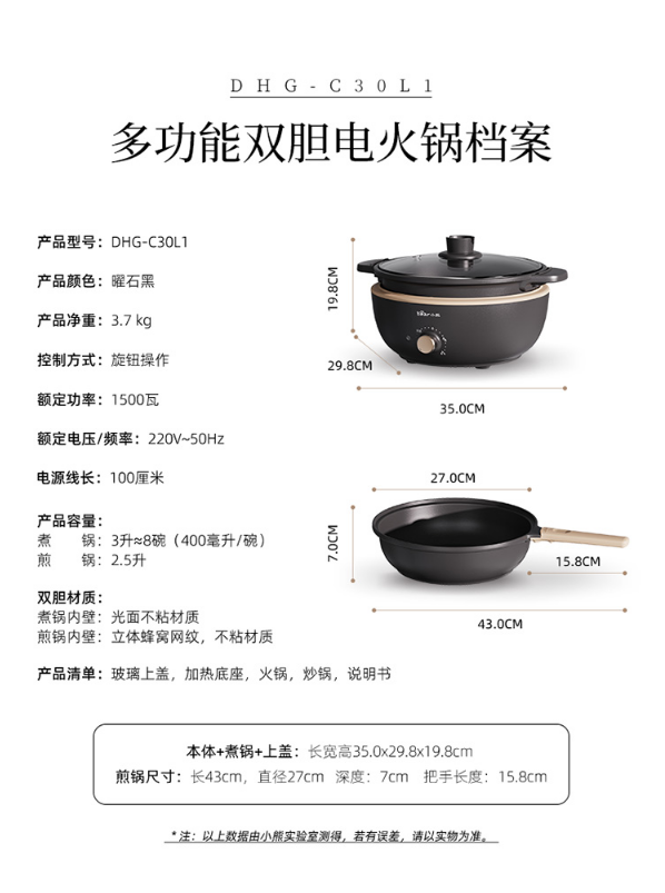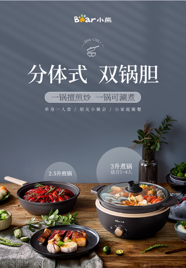 小熊(Bear)电炒锅 电火锅 电煮锅 电锅一体 电热锅 多功能锅多用途锅家用涮烤火锅锅具3L DHG-C30L1 自营