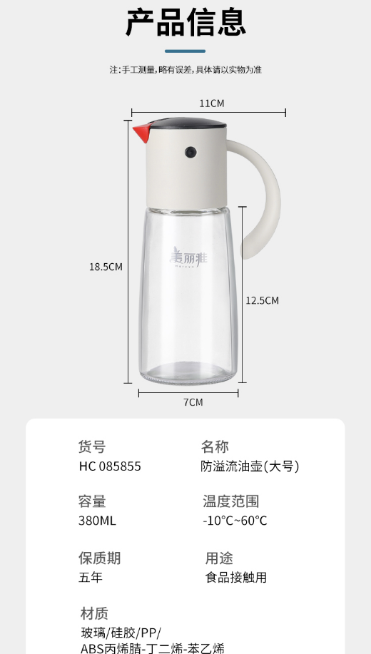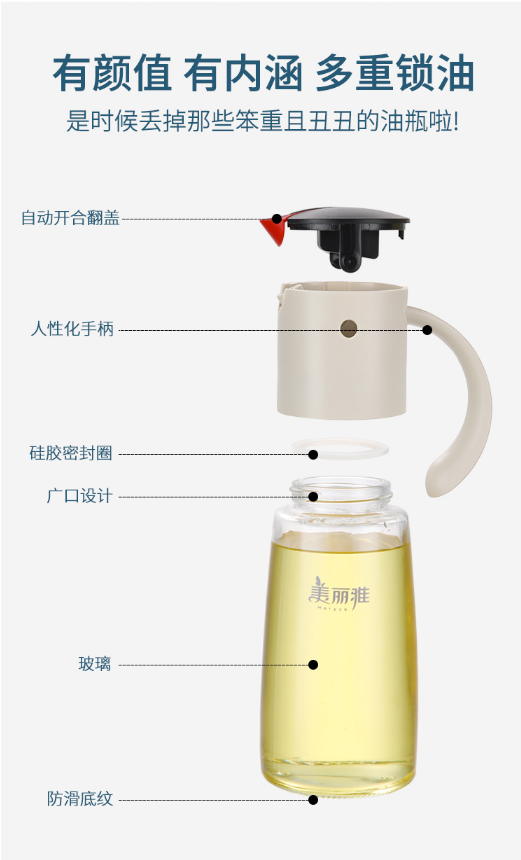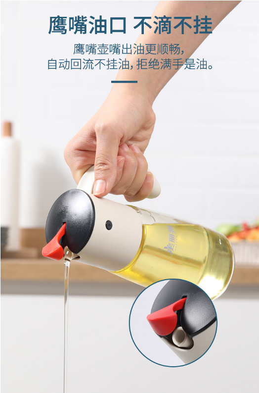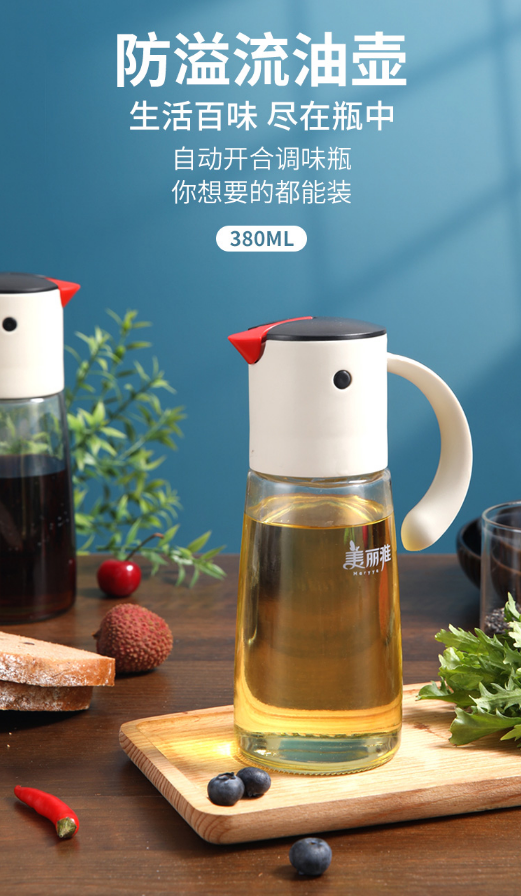 美丽雅 玻璃油壶不挂油380毫升 自动开合防漏厨房家用 装酱醋酒油瓶 自营