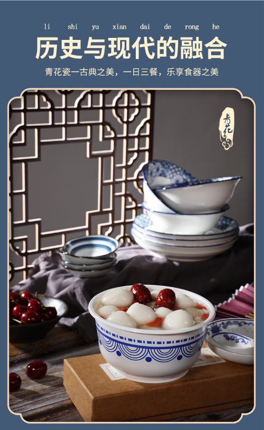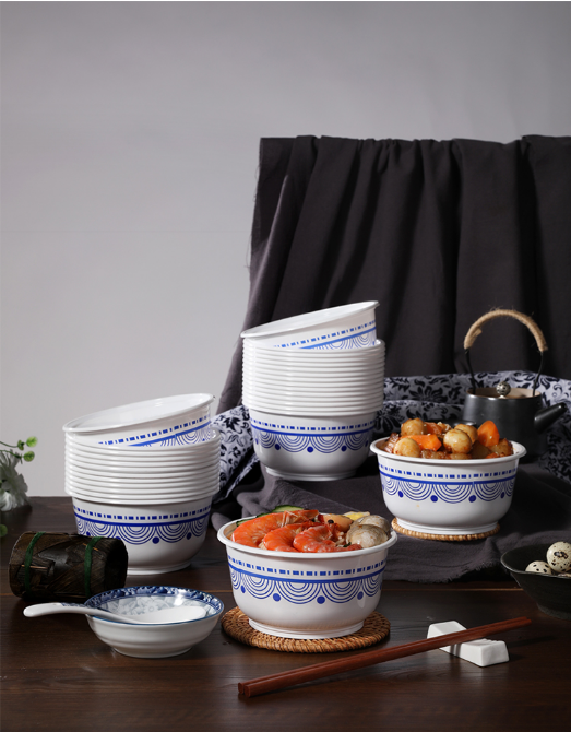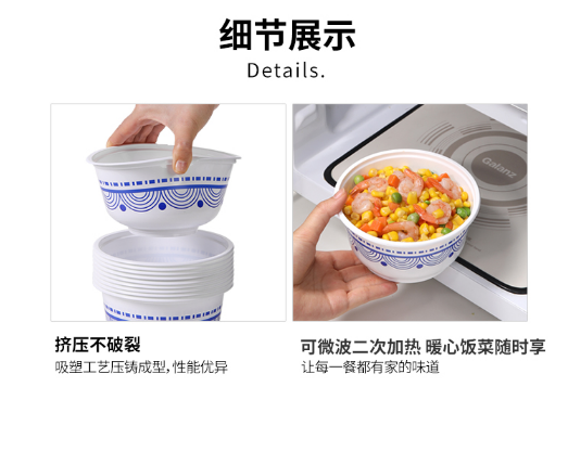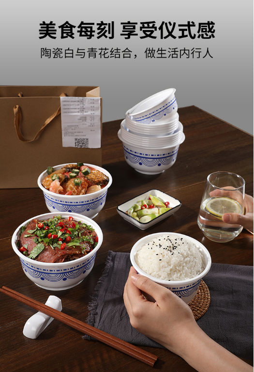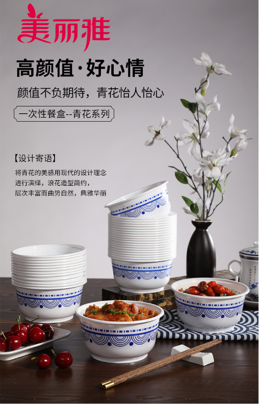 美丽雅 一次性青花餐盒700ml*20只 圆形餐盒家用汤碗外卖野炊餐盒冰粉打包餐盒塑料碗不带盖 自营